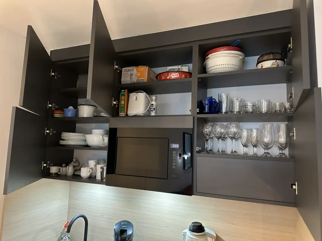 Der Raum bietet 32 Gästen Sitzplätze an den Tischen, Geschirr und Gläser sind für ca. 40 Personen vorhanden. Die Küche hält mit Herd, Kühl- und Gefrierschrank sowie Geschirrspüler und Kaffeemaschine alles vor, um ein gelungenes Fest zu organisieren.  Ein WC ist ebenfalls vorhanden.