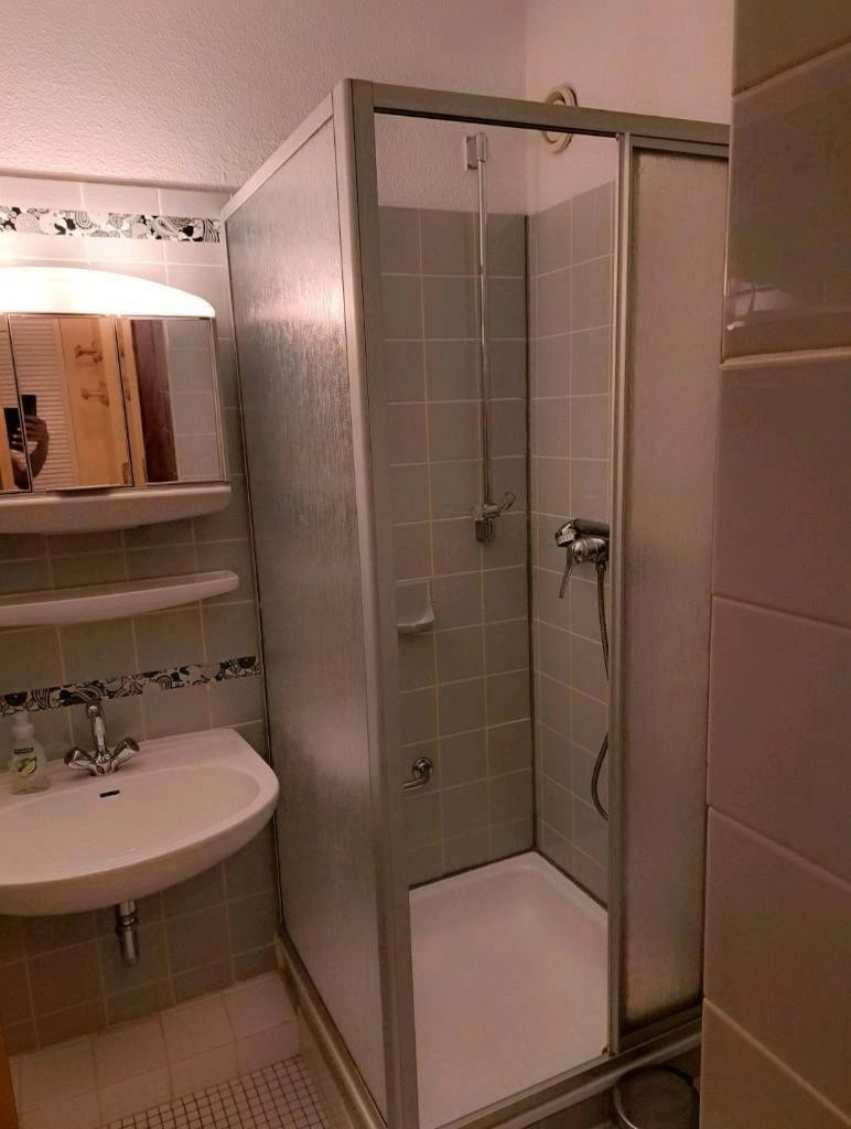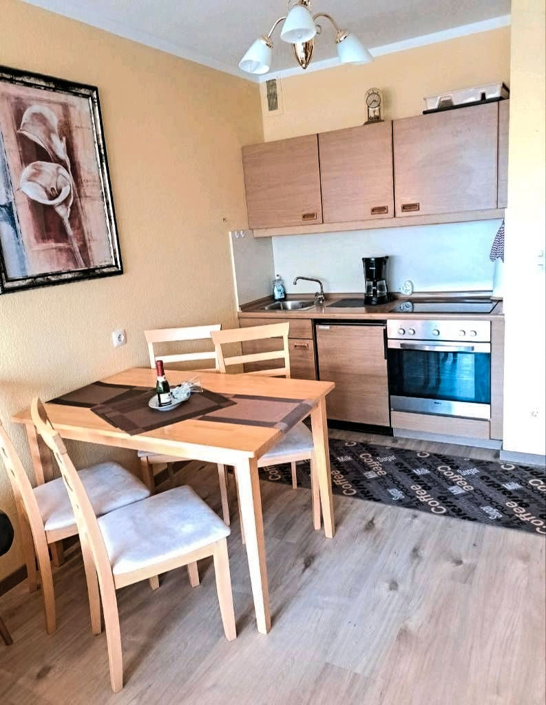 Die integrierte Kitchenette hat vier Kochfelder, Backofen, Kühlschrank mit Gefrierfach, Kaffeemaschine, Wasserkocher, Toaster und alles was Du benötigst, wenn Du nicht auswärts essen gehst. Das Bad verfügt über Duschwanne, Waschbecken und WC. Die Wohnung ist komplett mit Laminat ausgelegt und liegt sehr ruhig gelegen.